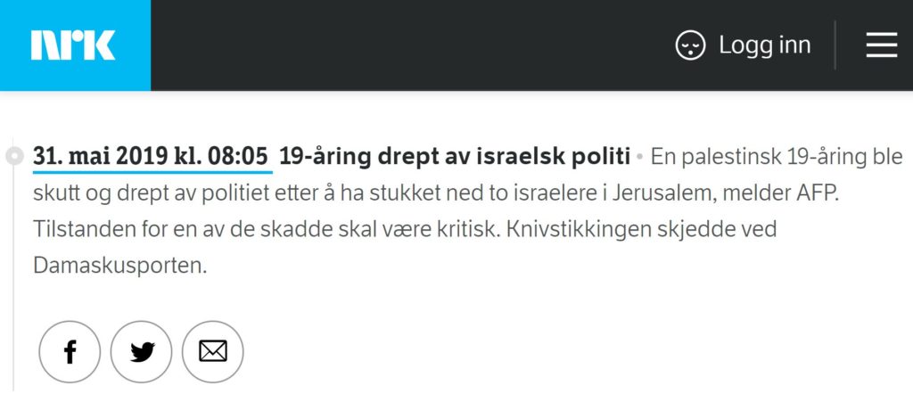 «19-åring drept av israelsk politi» lyder NRK-tittelen. NTB er på samme spor: «To palestinske ungdommer drept av israelske soldater»