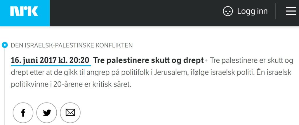 NRK er ikke i tvil om hvor fokus bør ligge. Vinklingen er at tre palestinerne er skutt og drept. At terroristene hadde kritisk såret et av ofrene (Hadas Malika døde senere av skadene), er så lite viktig at det kommer helt til slutt.