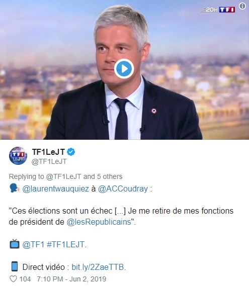 Laurent Wauquiez går av som leder for det franske høyrepartiet Republikanerne. Wauquiez har trukket partiet mot høyre, sier velgerne. EU-valget var skuffende for Republikanerne som kun fikk 8,48 % av stemmene. Det var det dårligste resultatet noensinne. Wauquiez sa i et intervju med den franske tv-kanalen TF1 at han trekker seg som leder.