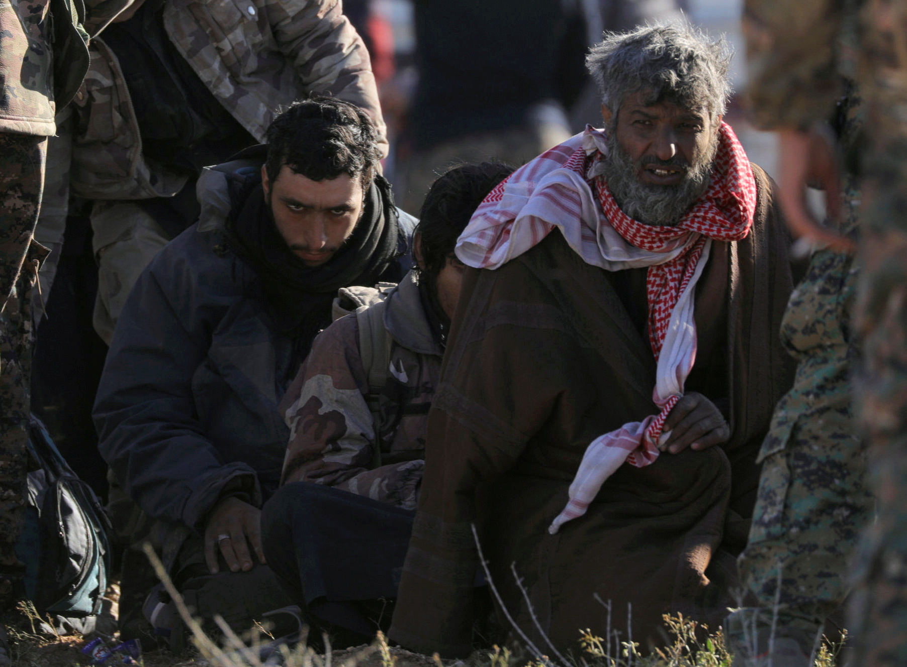 Menn som har forlatt den islamske statens (IS) siste bastion i Baghouz i den syriske Deir Al Zor-provinsen, er anholdt av Syrian Democratic Forces (SDF) den 1. mars 2019. Foto: Rodi Said / Reuters / Scanpix.