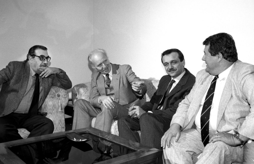 Tunis 30. januar 1989: Utenriksminister Thorvald Stoltenberg (Ap) på reise i midtøsten. Her sammen med (f.v.) Abu Jaffar nestkommanderende i PLOs utenriksråd, utenriksminister Thorvald Stoltenberg (Ap), Yasser Abed Rabbo og norges ambassadør i Kuwait Hans Wilhelm Longva.Foto: Bjørn Sigurdsøn NTB Scanpix
