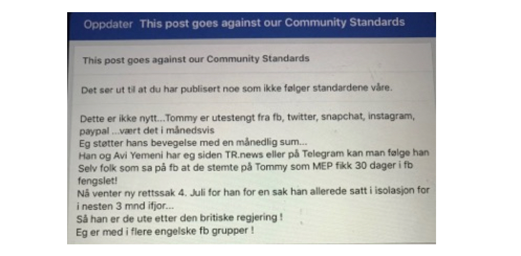 En skikkelse som Tommy Robinson er skummel for makteliten, samfunnsklassen som selv er beskyttet mot konsekvensene av sin egen maktutøvelse, ergo må han stanses. Han er kastet ut av Facebook og Twitter, hos YouTube er han plassert i hundehuset, og Amazon har nektet å selge bøkene hans. Folk som har offentliggjort adressen til Robinsons eget nettsted, er blitt suspendert i tredve dager fra Facebook.