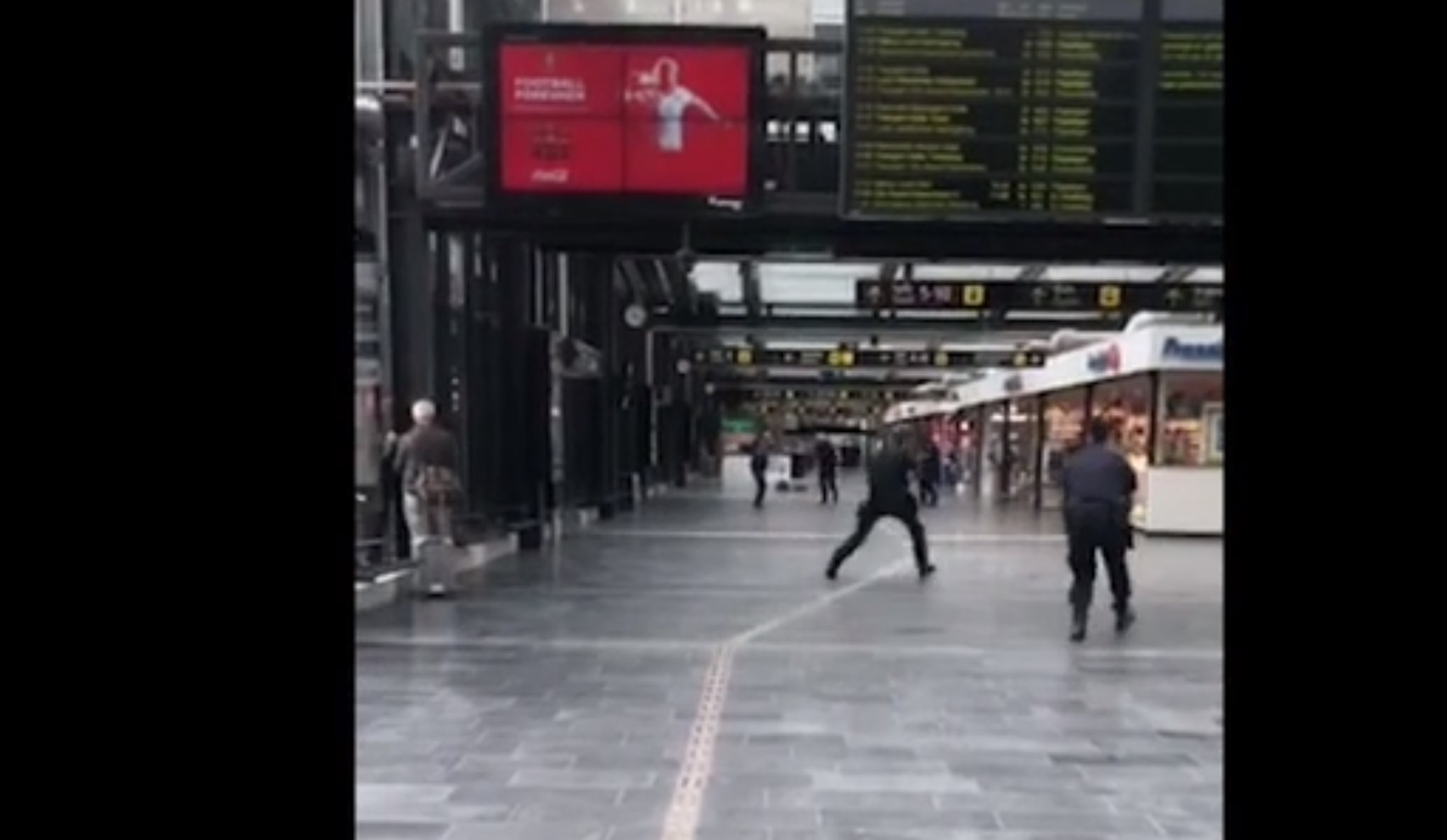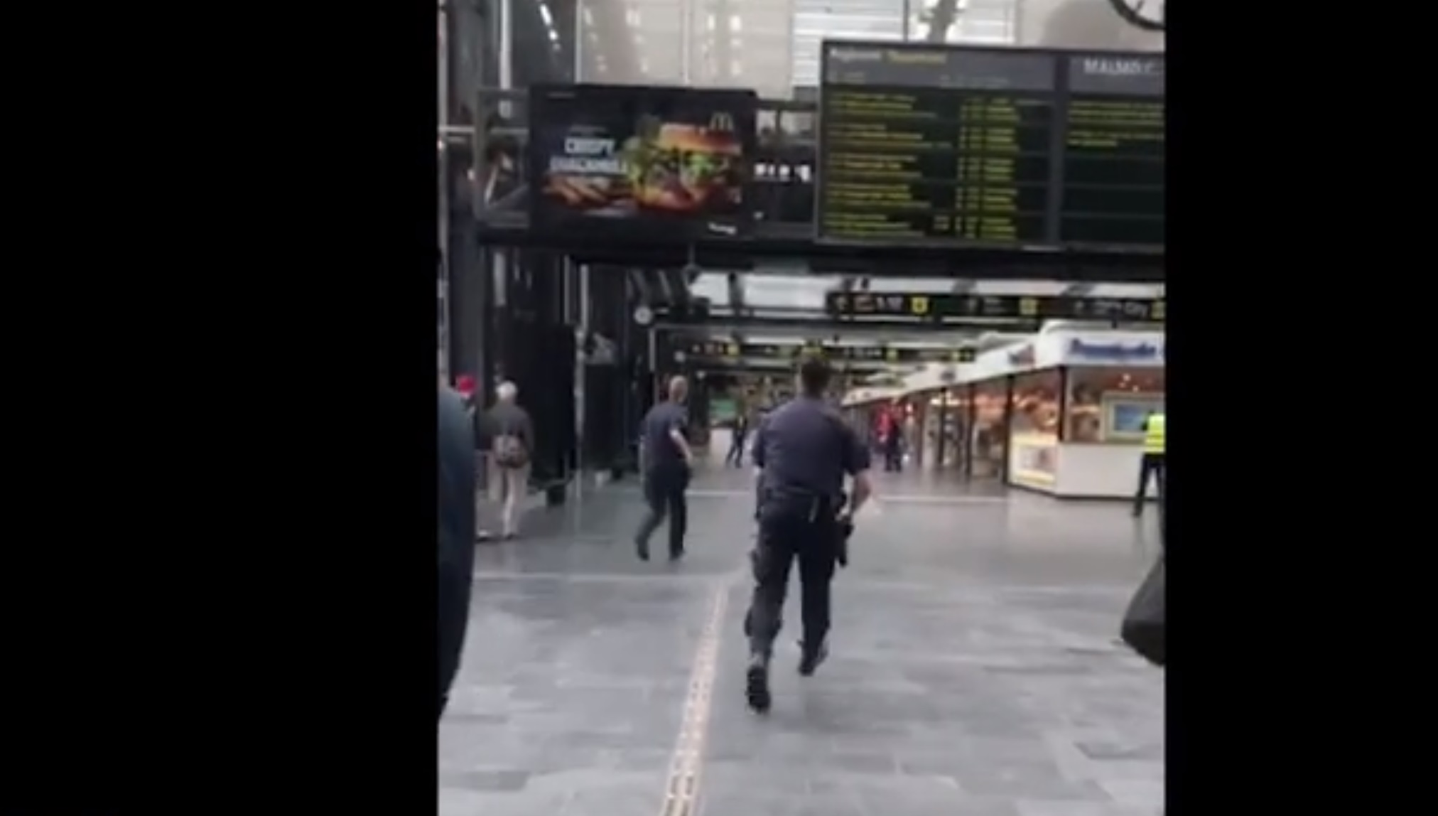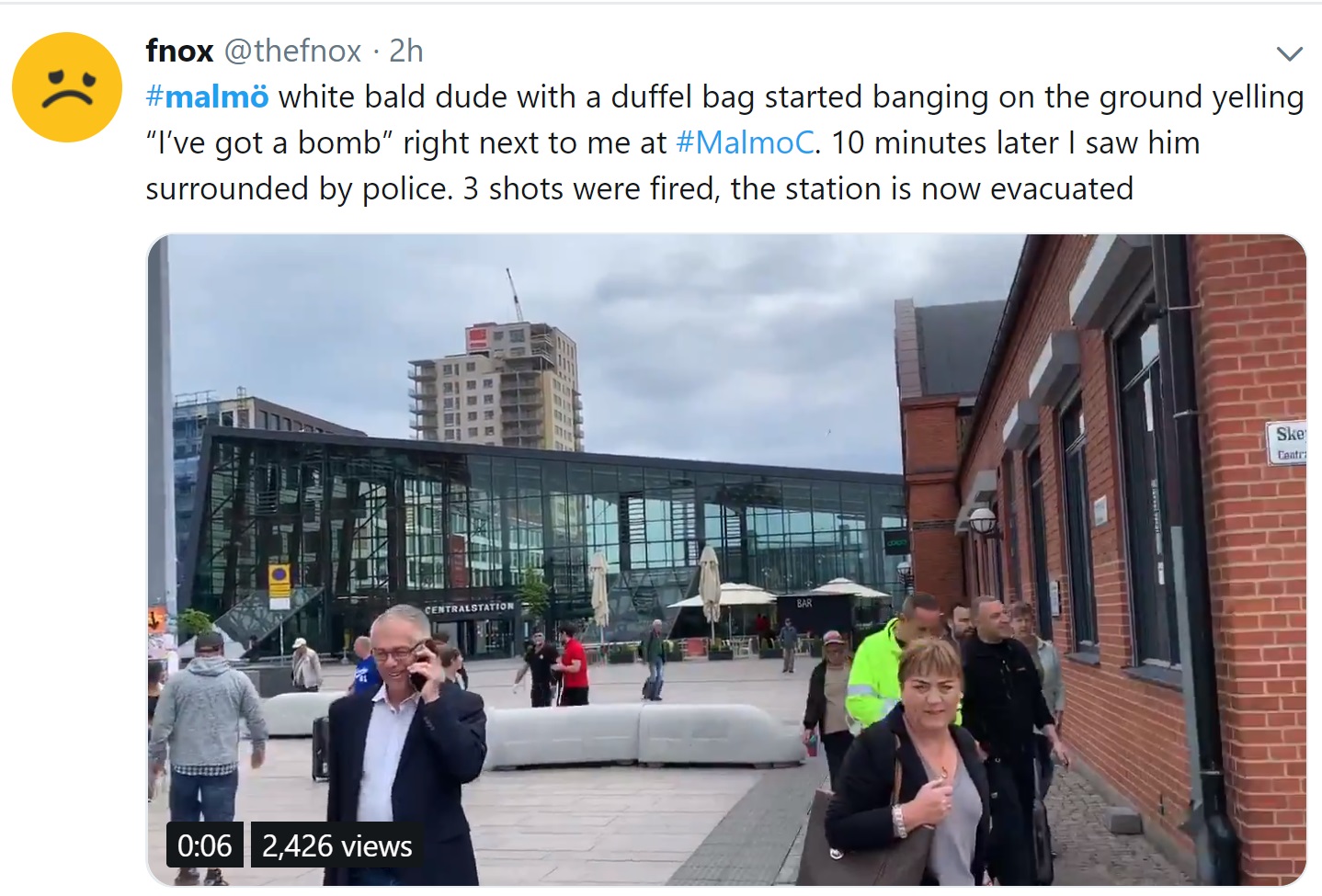 Full utrykning på Malmö sentralbanestasjon da en mann med to vesker opptrådte truende og sa han bar på en bombe. Det endte med at han ble skutt av politiet og en veske ble sprengt. Hele stasjonen ble avsperret og folk kom seg hverken med tog eller buss.
