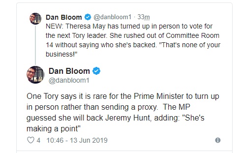 Den politiske redaktøren i Mirror online tvitrer at Theresa May har stemt på den neste lederen, men at hun ikke vil si hvem hun har stemt på.