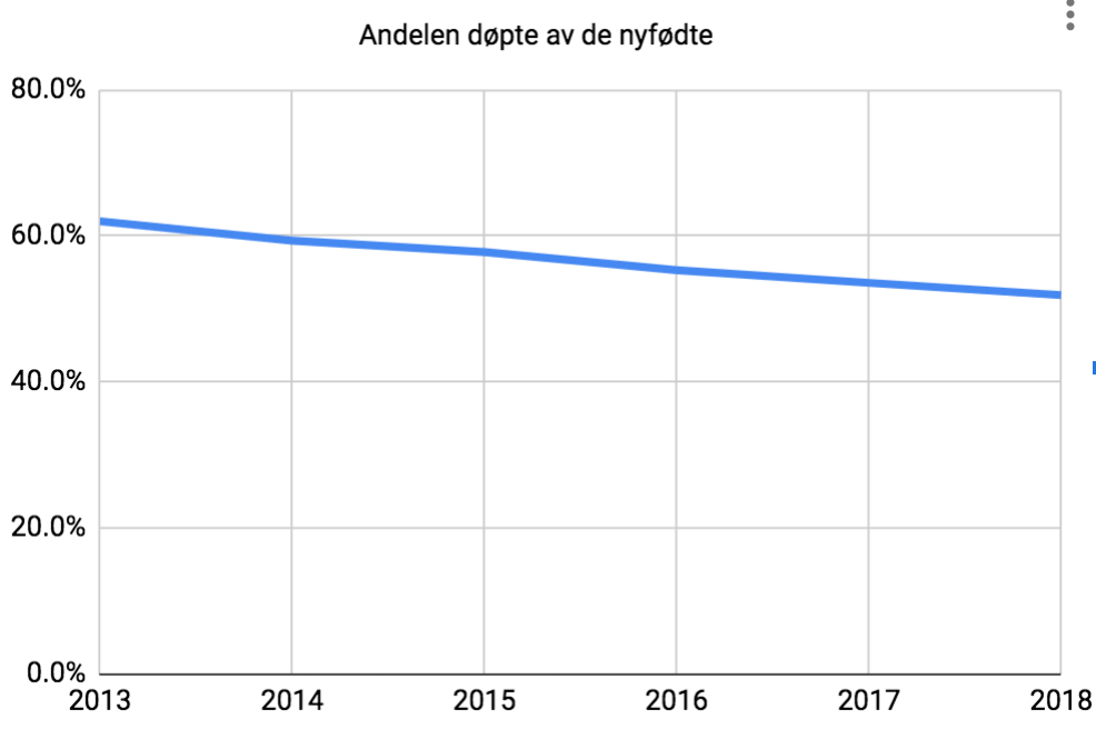 Om man ser disse tallene i forhold til antall fødte, ser man at andelen døpte har sunket fra ca. 62 til ca. 52 prosent, altså en nedgang på ti prosentpoeng på bare fem år.