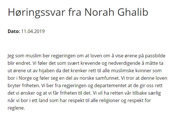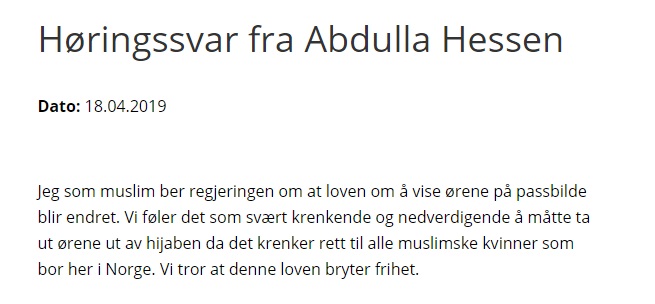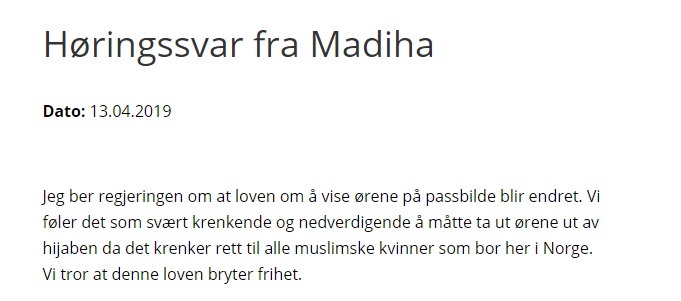 «Vi tror at denne lov bryter frihet». Frihet? Hva med oss som mener at hijab bryter med frihet? Vi klikker oss inn på et tilfeldig utvalg av de hundrevis av svarene: