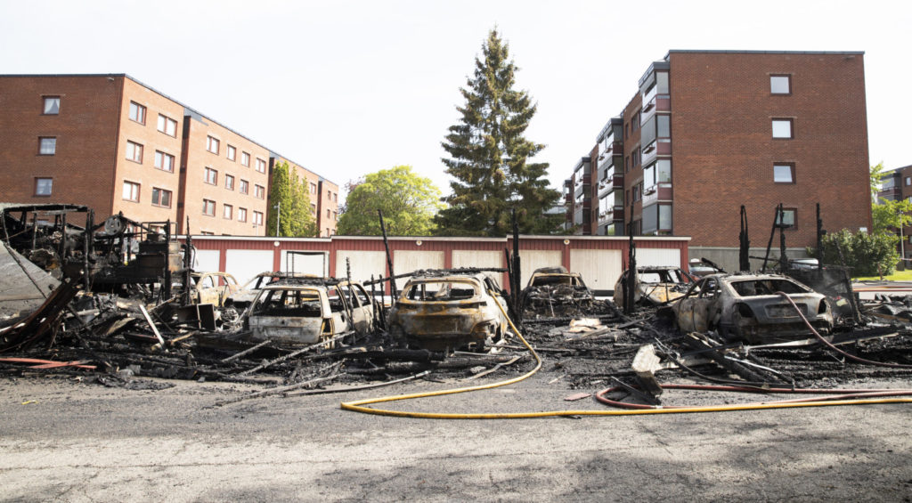 Åtte biler ble totalskadd etter at det begynte å brenne i enda en garasje i Haugerudveien tidlig søndag morgen. Foto: Berit Roald / NTB scanpix