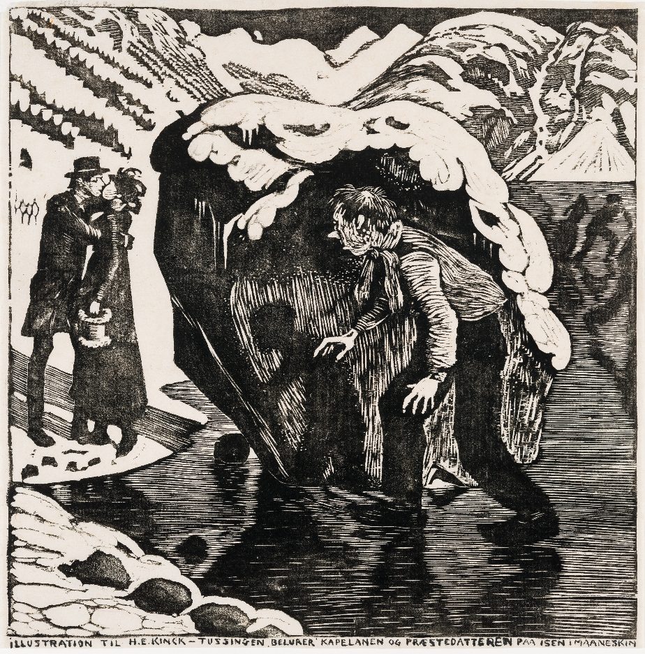 Nikolai Astrup har gjort flere tresnitt-illustrasjoner til Kincks noveller, hvor Tussingen figurerer. I dagens bilde vil man legge merke til at fjellpartiet øverst i midten ser ganske kvinnelig ut.
