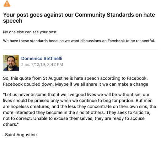 Et sitat av teologen og filosofen St. Augustin (354–430 e.Kr.), en av Vestens aller fremste åndelige fedre, som en amerikaner nylig postet til Facebook, viste seg nemlig å være uakseptabelt i Mark Zuckerbergs paradis: