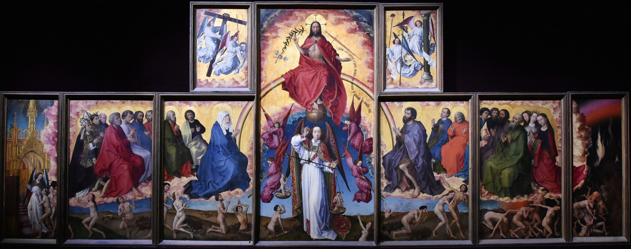 Øverst sitter en tronende Jesus, i de mindre panelene på hans sider viser hvitkledde engler kors, tornekrone, lanse, røret med eddiksvampen, og pisken samt søylen han ble pisket ved. Rett under Jesus erkeengelen Michael i ferd med å veie de oppstandne, og avgjøre hvilken vei de skal sendes.