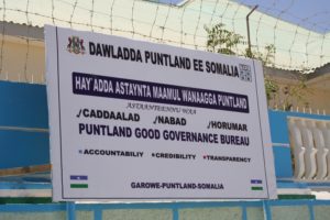 Skiltet til Puntlands senter for godt styresett og anti-korrupsjonsbyrå. Merk flaggene nederst i hvert hjørne. Foto: horseedmedia.net