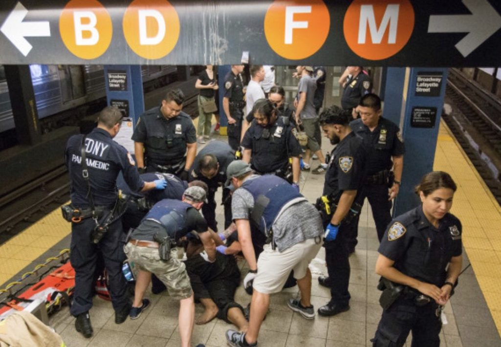 Det 30-årige offer er ifølge amerikanske medier ansat på det stærkt venstreorienterede og politiske korrekte medie The New York Times. Manden brækker hoften og får nogle alvorlige sår under sit fald fra perronen.