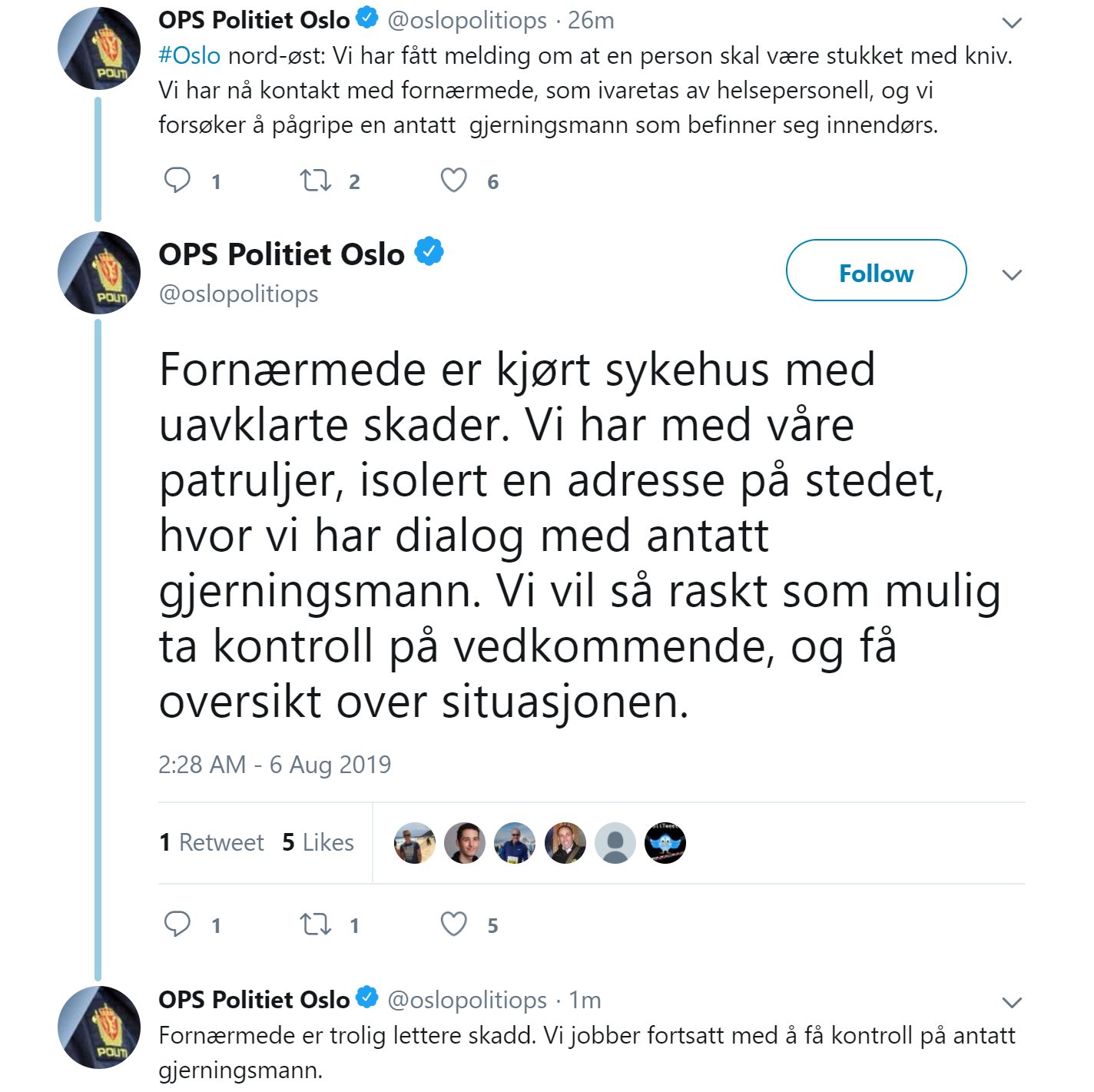 – Vi har fått melding om at en person skal være stukket med kniv. Vi har nå kontakt med fornærmede, som ivaretas av helsepersonell, og vi forsøker å pågripe en antatt gjerningsmann som befinner seg innendørs, opplyser politiet.