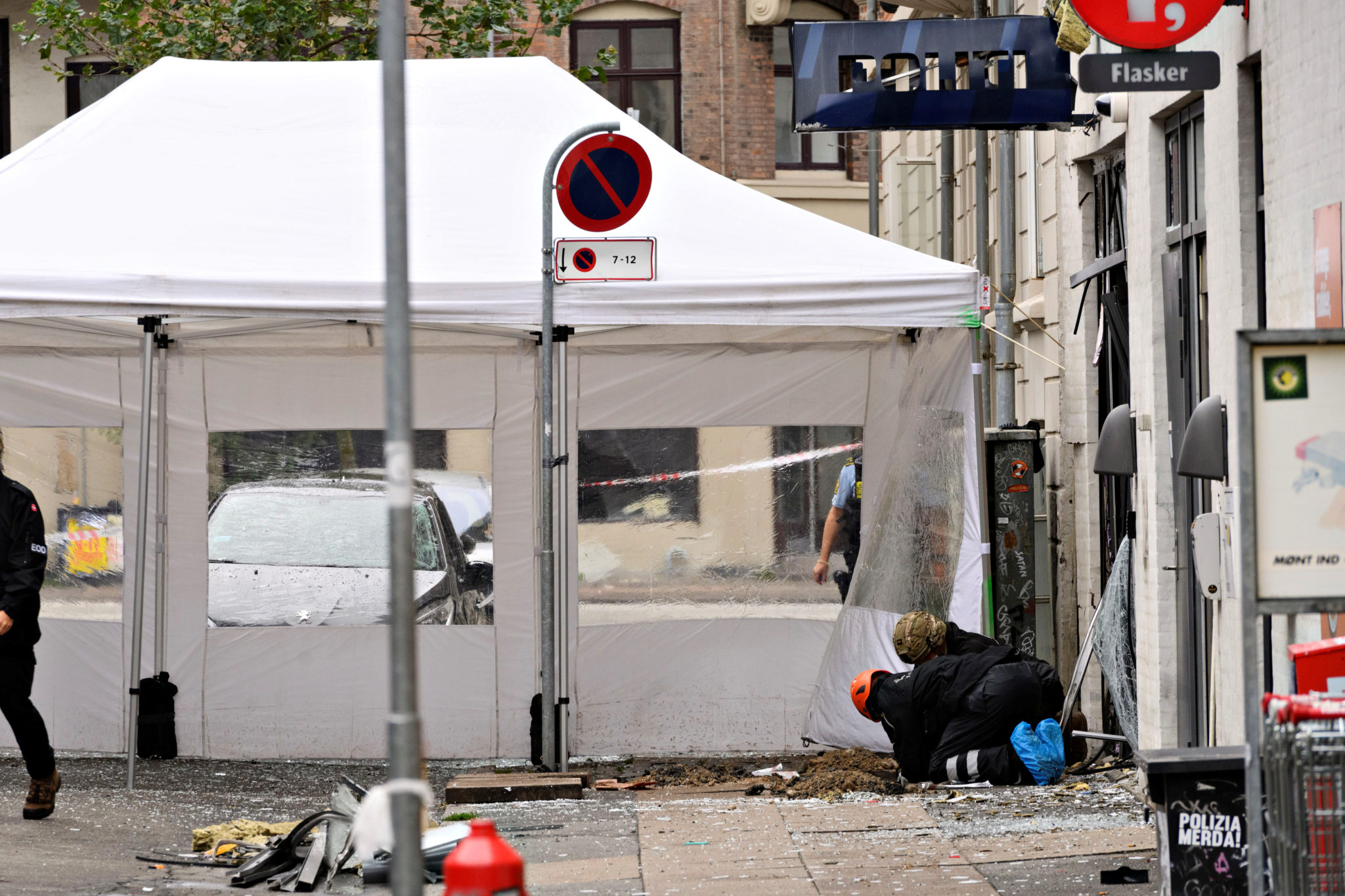 Kriminalteknikere er i arbeid utenfor politistasjonen i København som ble rammet av en eksplosjon natt til 10. august 2019. Foto: Philip Davali / Reuters / Ritzau Scanpix.