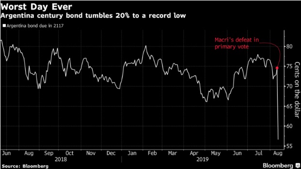Børsen i Argentina stupte over 30 prosent etter at president Mauricio Macri gjorde det dårlig i primærvalget før presidentvalget i landet. Sentrum-venstrekandidaten Alberto Fernández vant søndag primærvalget med god margin.