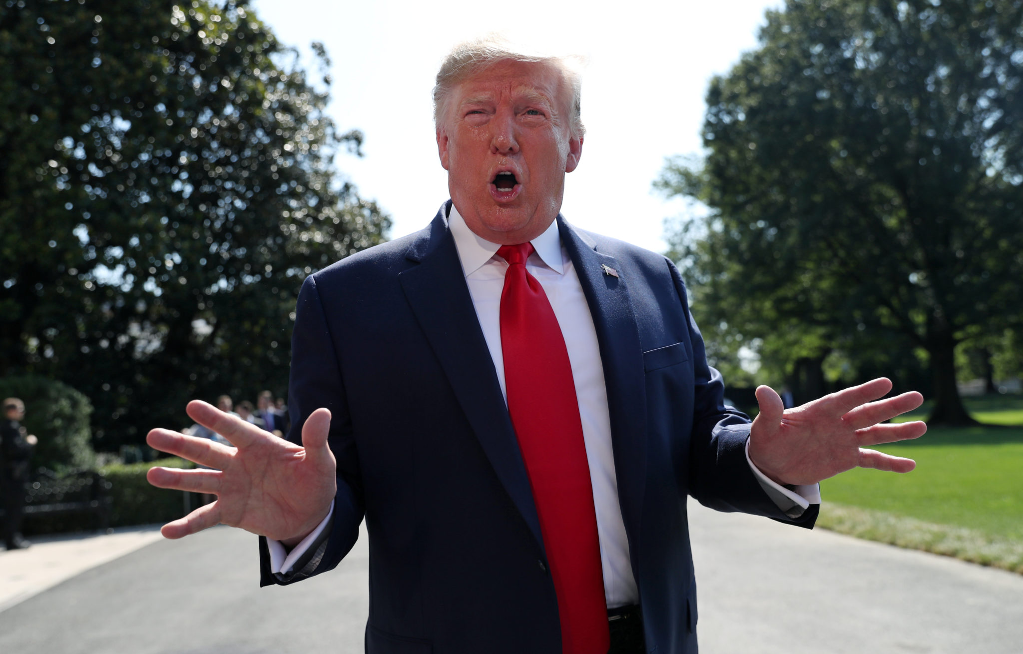 USAs president Donald Trump snakker med reportere på plenen utenfor Det hvite hus i Washington, D.C., på vei til New York og New Jersey den 9. august 2019. Foto: Leah Millis / Reuters / Scanpix.
