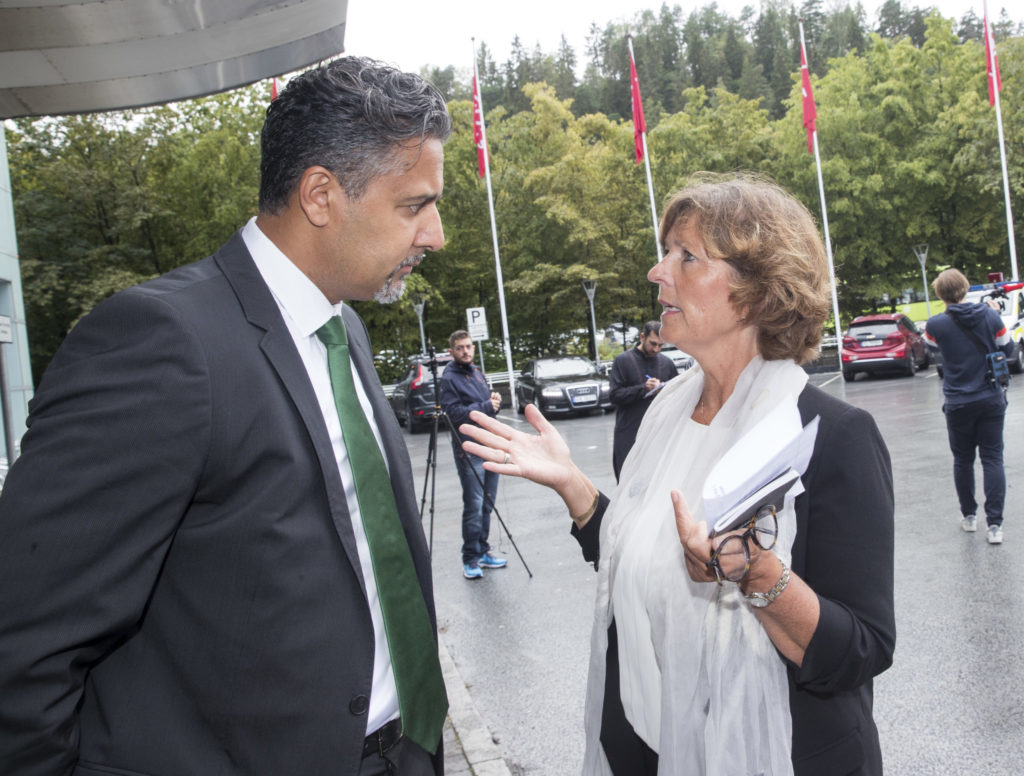 Abid Raja lytter til Lisbeth Hammer Krog som om det er han som er ordføreren og ikke hun. De er på plass da menigheten i Al-Noor Islamic Centre i Bærum samles til Eid på Thon hotel i Sandvika. Foto: Terje Pedersen / NTB scanpix