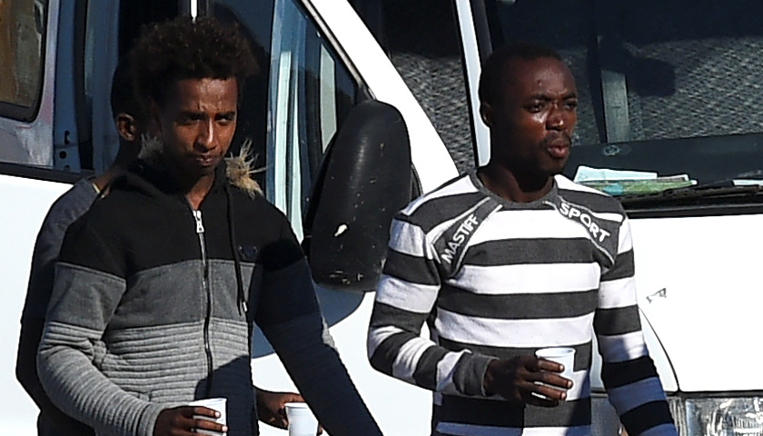 Angivelig mindreårige migranter som fikk forlate «Open Arms», går i land på havnen på Lampedusa den 17. august 2019. Foto: Guglielmo Mangiapane / Reuters / Scanpix.