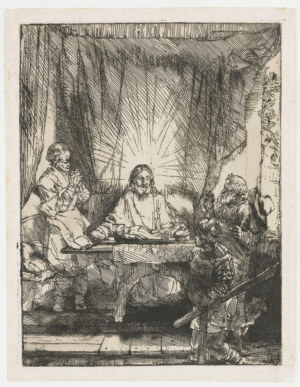 Teksten omtaler to disipler, hvorav bare Kleopas er navngitt, mens det i Rembrandts trykk er tre personer foruten Jesus. Den tredje er muligens husverten i Emmaus.