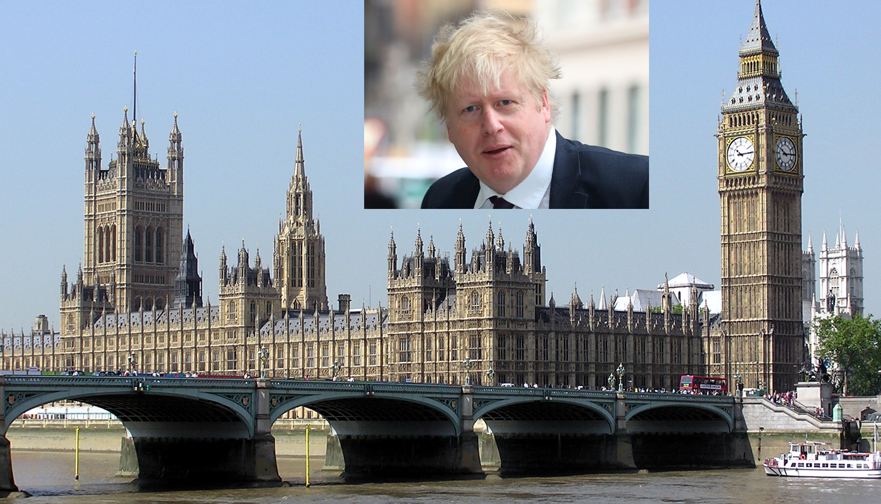 Parlamentsbygningen i London. Foto: Adrian Pingstone / Wikimedia Commons. Innfelt: Boris Johnson. Foto: Hannah McKay / Reuters / Scanpix.