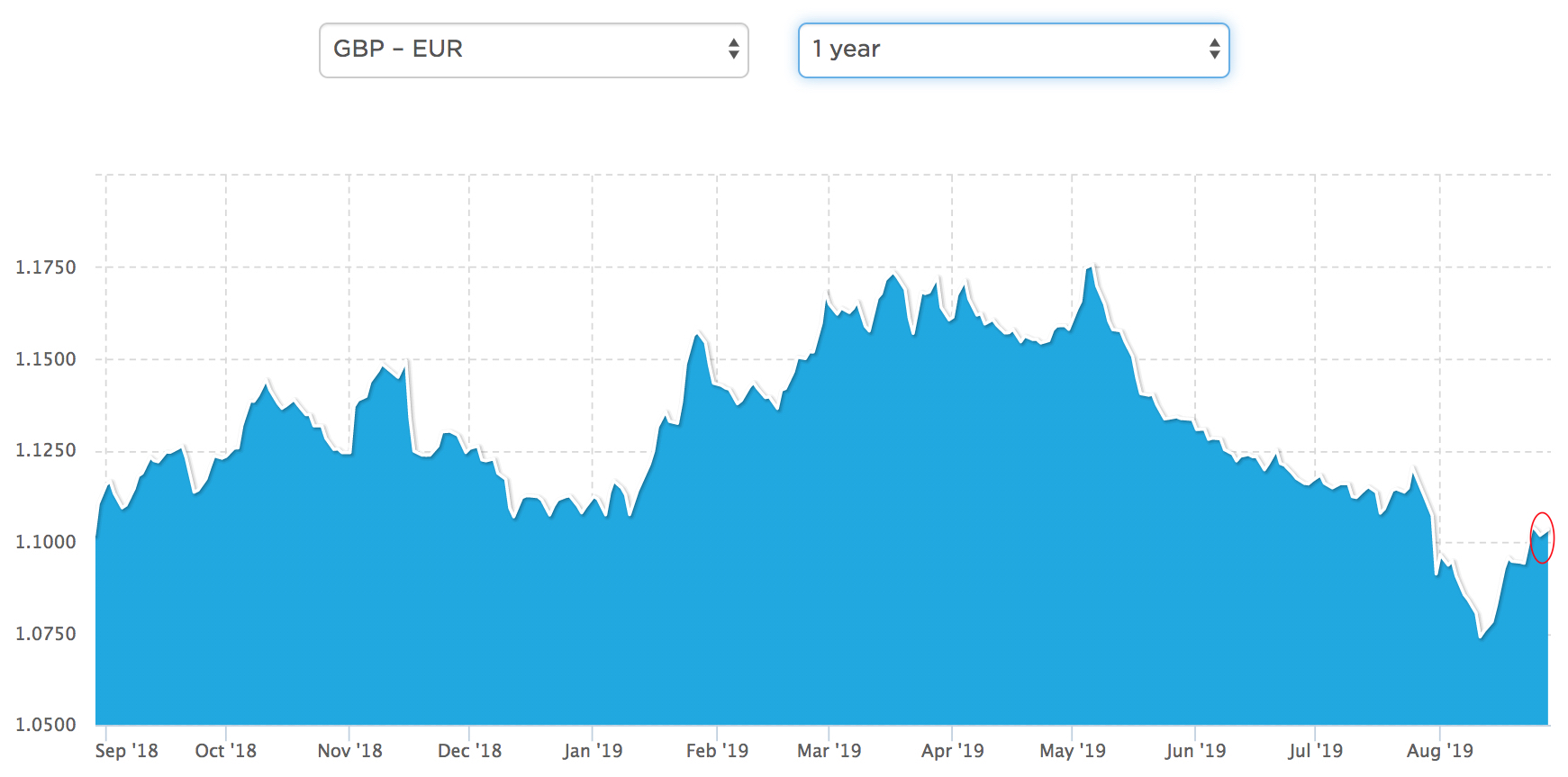 1 pund var altså verdt 1,1104 euro for ett år siden, mot 1,1034 i skrivende stund. Det er en variasjon på ca. 0,6 prosent i løpet av ett år, og i mellomtiden har pundet vært både høyere og lavere enn nå.