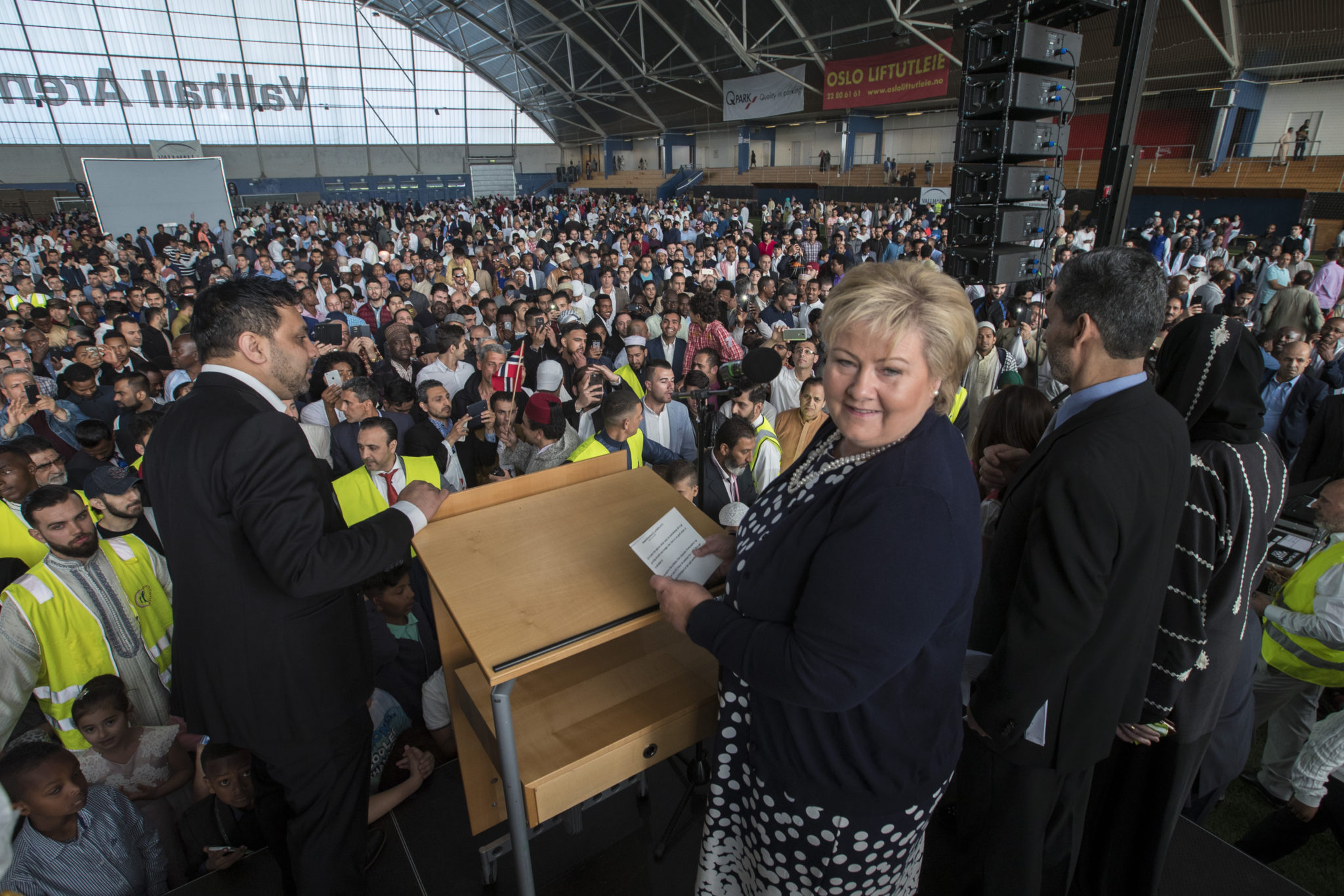 Statsminister Erna Solberg (H) besøker en kjønnsdelt forsamling bestående av Islamic Cultural Centre (ICC) og Det islamske forbundet (Rabita) i forbindelse med feiringen av id den 25. juni 2017. Foto: Vidar Ruud / NTB scanpix.