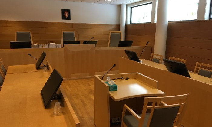 Fagdommeren ville dømme tiltalte, men de to meddommerne gikk inn for frifinnelse. Både de to dømte brødrene og han som nå er frifunnet er fra land sør i Øst-Europa. Rettssal 1 i Sogn og Fjordane tingrett. Foto: domstol.no.