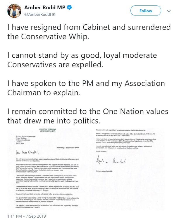 Den britiske ministeren for arbeid og likestilling, Amber Rudd, har trukket seg fra regjeringen. Amber Rudd har vært en av de mest profilerte remainerne blant de konservative politikerne. Hun trekker seg også fra det konservative partiet, men sier hun vil fortsette som uavhengig representant i Parlamentet.