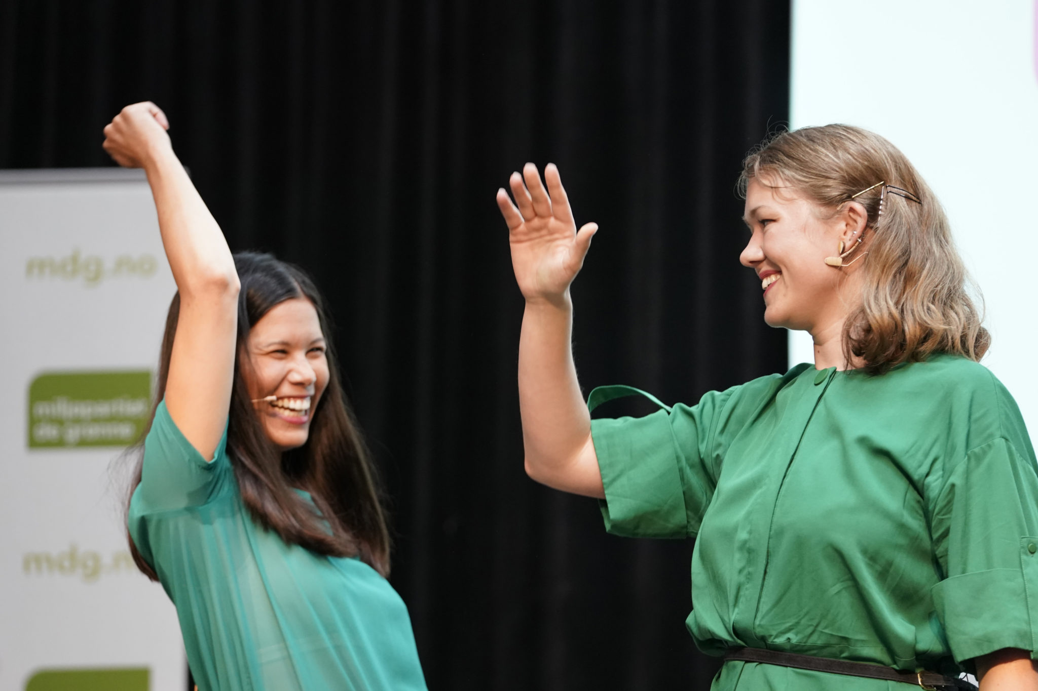 Lan Marie Berg (tv) og Une Batsholm under MDGs valgkampåpning i forbindelse med kommunevalget 2019 i Oslo den 16. august 2019. Foto: Cornelius Poppe / NTB scanpix.