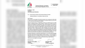 Brevet fra den iranske olympiske komiteen der de lover å respektere prinsippene om ikke-diskriminering av andre land i den olympiske familie.
