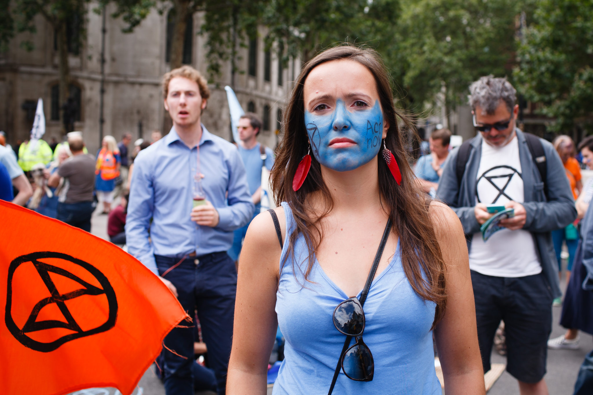 En kvinne påmalt slagordet «Act now» deltar i aktivistgruppen Extinction Rebellions demonstrasjon i London 15. juli 2019, hvor man bl.a. forlangte kriminalisering av «ecocide», dvs. ødeleggelse av økosystemer. Foto: David Cliff / Zuma Press / Scanpix.