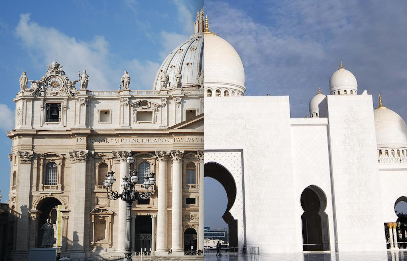 Til venstre: Peterskirken i Roma. Til høyre: Stormoskeen i Abu Dhabi. Fotografier: Mstyslav Chernov / Wikimedia Commons og Luca Zennaro / EPA / Scanpix (begge utsnitt, sammenstillingen er Documents).
