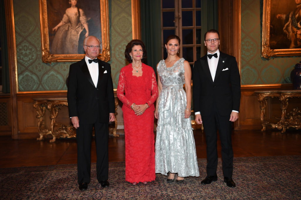 STOCKHOLM 20190920 Kung Carl Gustaf, drottning Silvia, kronprinsessan Victoria och prins Daniel hälsar gästerna välkomna till Sverigemiddagen 2019 på Stockholms Slott. Foto Fredrik Sandberg / TT/Scanpix