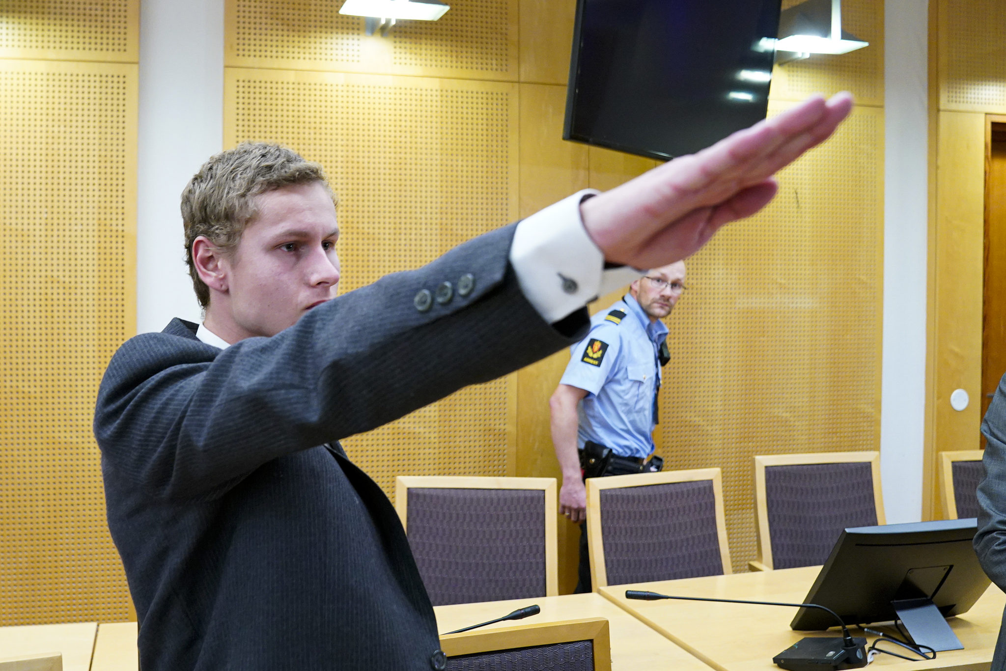 Draps- og terrorsiktede Philip Manshaus gjør nazihilsen idet han ankommer rettssal 127 i Oslo tingrett til fengslingsmøte 9. september 2019. Foto: Heiko Junge / NTB scanpix.