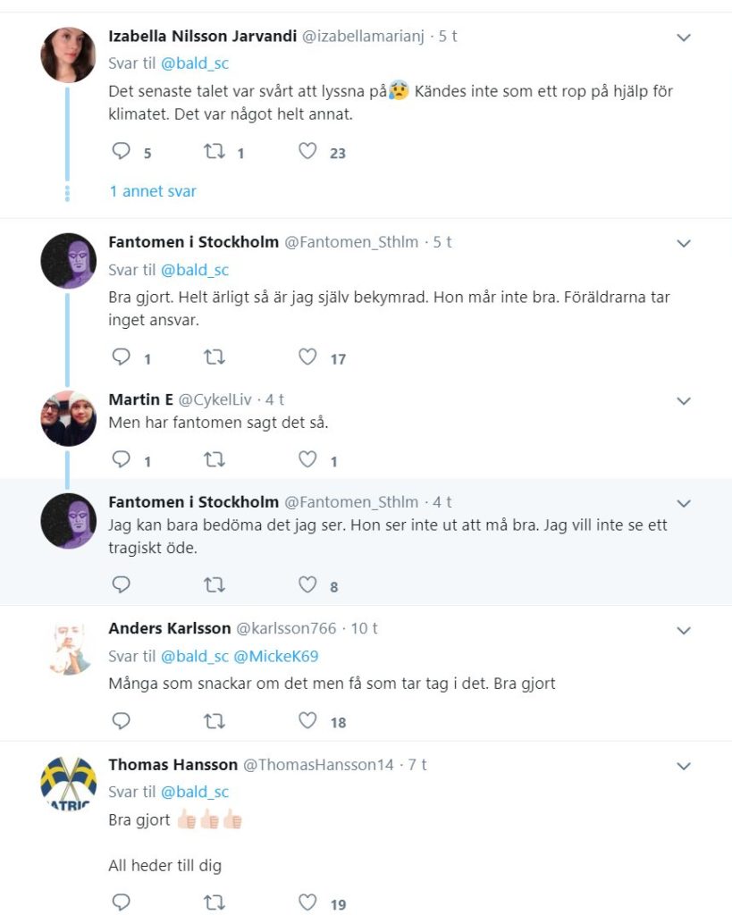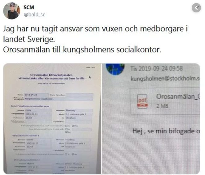 Tirsdag har en privatperson publisert bilder på Twitter av en bekymringsmelding om Greta Thunberg. Ifølge personen skal meldingen være sendt til Kungsholmens socialkontor i Stockholm. Vedkommende har også publisert en skjermdump av en epost med et vedlegg som heter «Orosanmälan_Greta». Eposten skal ha blitt sendt til bydelsforvaltningen tirsdag morgen: