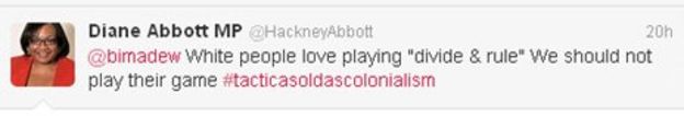 La oss heller ikke glemme en annen Labour-topp, Diana Abbott. Den hyklerske Abbott, som er viden kjent for sin dobbeltmoral, viste seg å ikke helt være en del av «oss». Hvite mennesker elsker å leke splitt og hersk, sa hun for noen år tilbake.