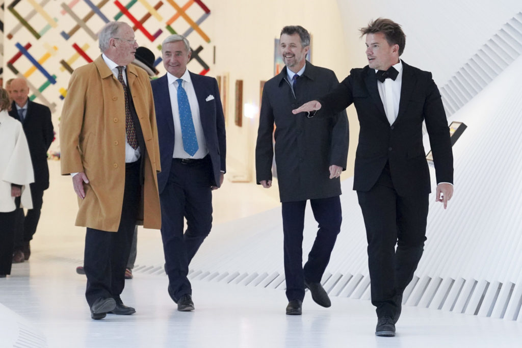 Det er noe flashy over de to danske gjestene: Arkitekt Bjarke Ingels (fra høyre), kronprins Frederik og Christen Sveaas under åpningen av Kistefos’ nye museumsbygg «The Twist». Foto: Fredrik Hagen / NTB scanpix