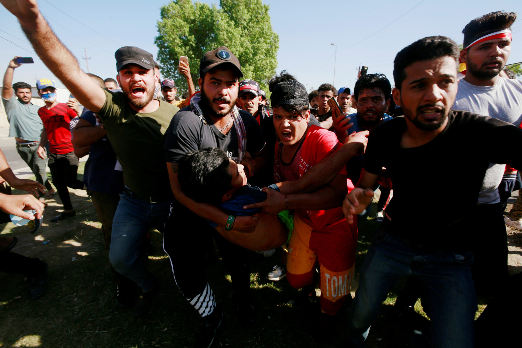 En skadet demonstrant bæres bort fra en protest under et portforbud i Bagdad den 4. oktober 2019. Foto: Alaa al-Marjani / Reuters / Scanpix.