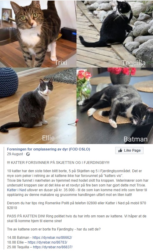 25. august i år fant familien Almerud katten sin Trixie død i en grøft like ved der de bor på Skjetten, rett utenfor Oslo. Trixie hadde blitt hugget hodet av.