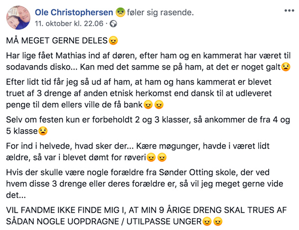 Er på vej fra Gaden, ad Bispensgade, stille og roligt, kan lige nå Mac D inden jeg skal ned til toget. Helt alene…. er lidt træt. På min venstre side kommer der pludselig 3-4 sorte fyre. En af dem gør lidt nar af at jeg er træt. Siger til ham 2-3 gange at det er ikke pænt, dårlig stil, stop det shit!