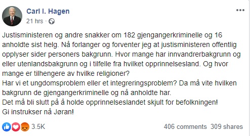 Carl I. Hagen har sett seg lei på at ingen vil snakke om hvem de gjengangerkriminelle er. Dette er nødvendig for å finne ut hvor problemet ligger, mener han og spør om vi har et ungdomsproblem eller et integreringsproblem. I et innlegg på Facebook skriver han: