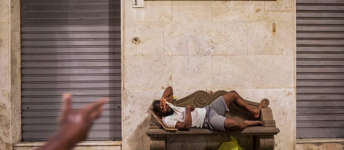 Migrants from Nigeria in front of a religious articles shop. Photo: Alessio Mamo/redux/Scanpix