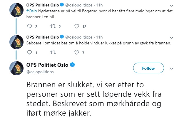 Vitner så to personer løpende vekk fra bilbrannen. De beskrev dem som mørkhårede og iført mørke jakker.