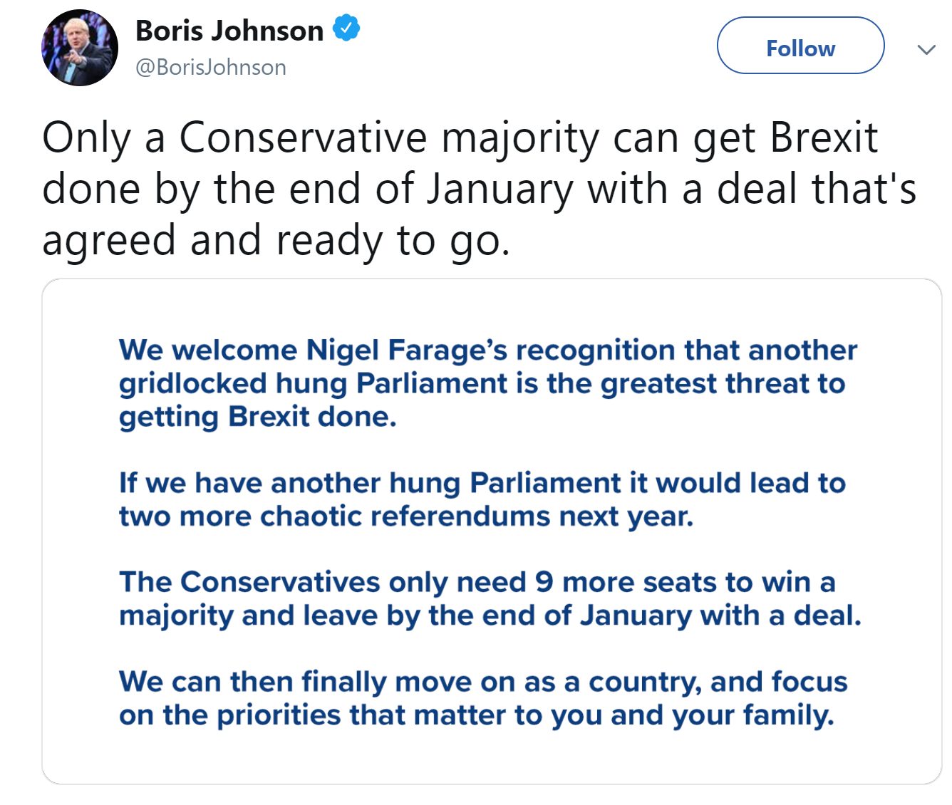 Boris Johnson har hele tiden sagt at han ikke vil samarbeide med Brexit-partiet som heller ikke ville akseptere den avtalen som de konservative hadde fremforhandlet med EU.