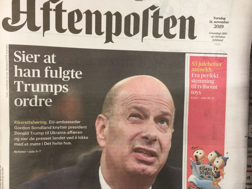 Aftenposten vil ha leserne til å tro at Trump ble felt da EU-ambassadør Gordon Sondland vitnet for Kongressen onsdag. Men forsiden er helt feil. Det var Sondland som måtte ta tilbake alt han sa. Så hvordan kan norske medier fortsette å formidle alt CNN og de andre anti-Trump-mediene melder? Er dette måten å skjøtte samfunnsoppdraget på?