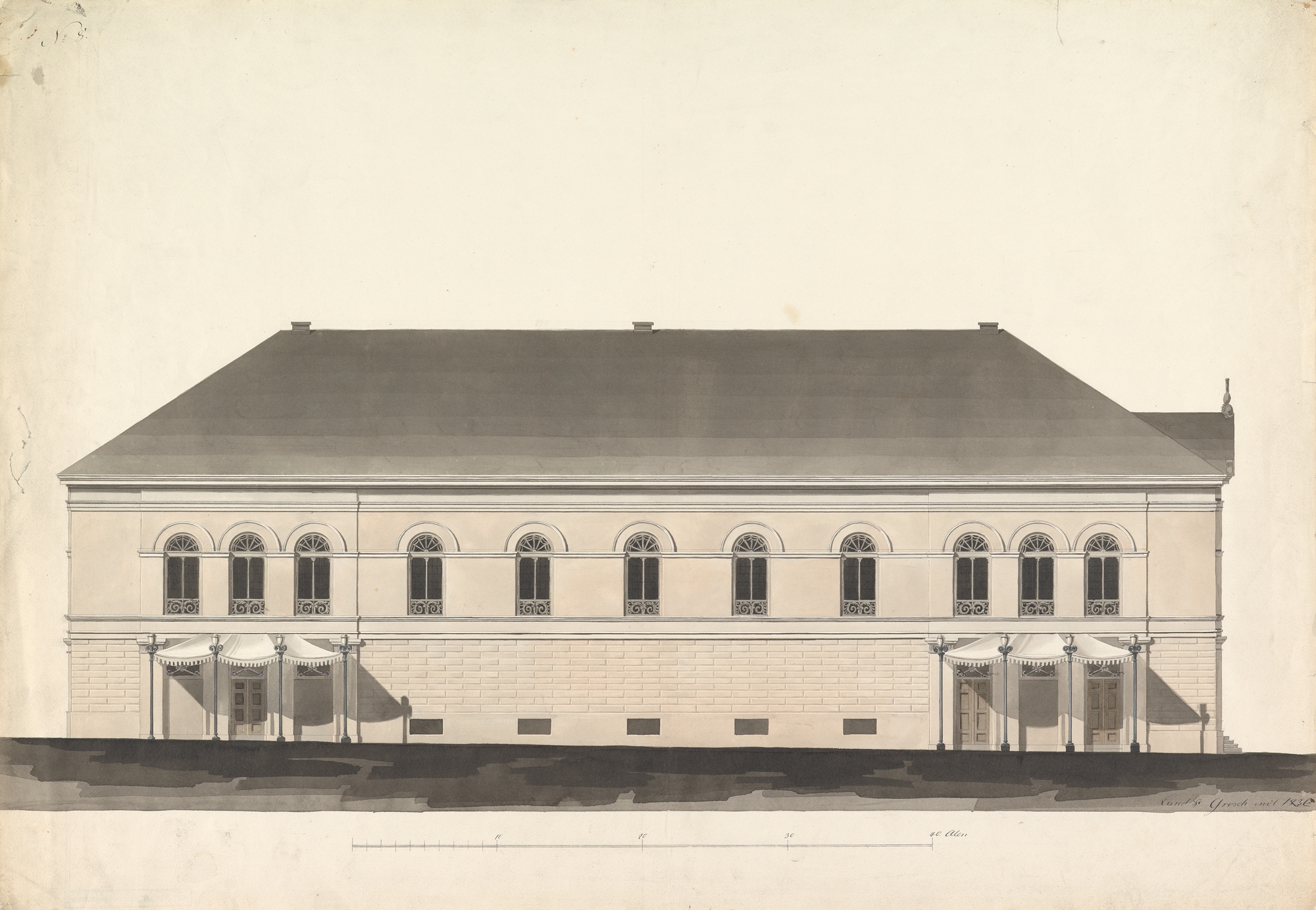 Dette er én av flere presentasjonstegninger av teatrets fasade.