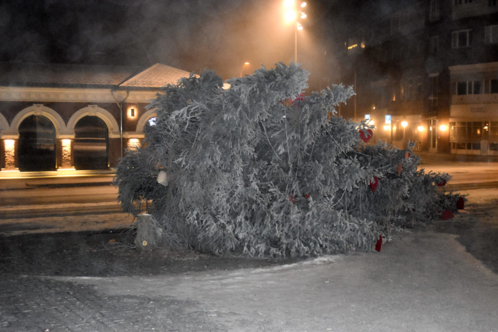 Det flere meter høye juletreet på Stortorvet i Hamar er saget ned i løpet av natten. Politiet fikk melding fra tilfeldig forbipasserende om hærverket rundt klokken 4.30 torsdag morgen.