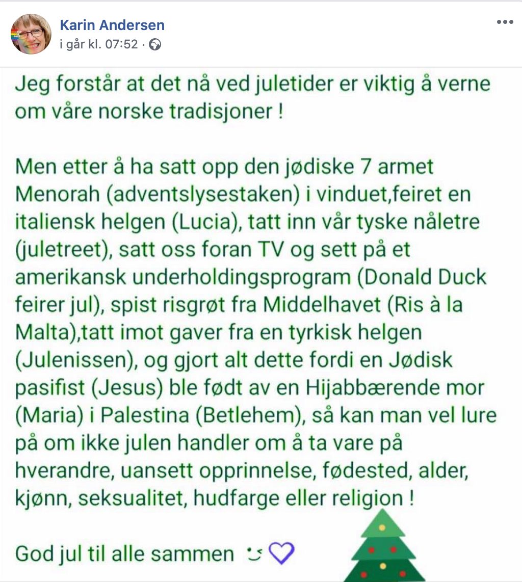 Nå er det SVs Karin Andersen som setter diverse kommentarfelt i full fyr med denne teksten: