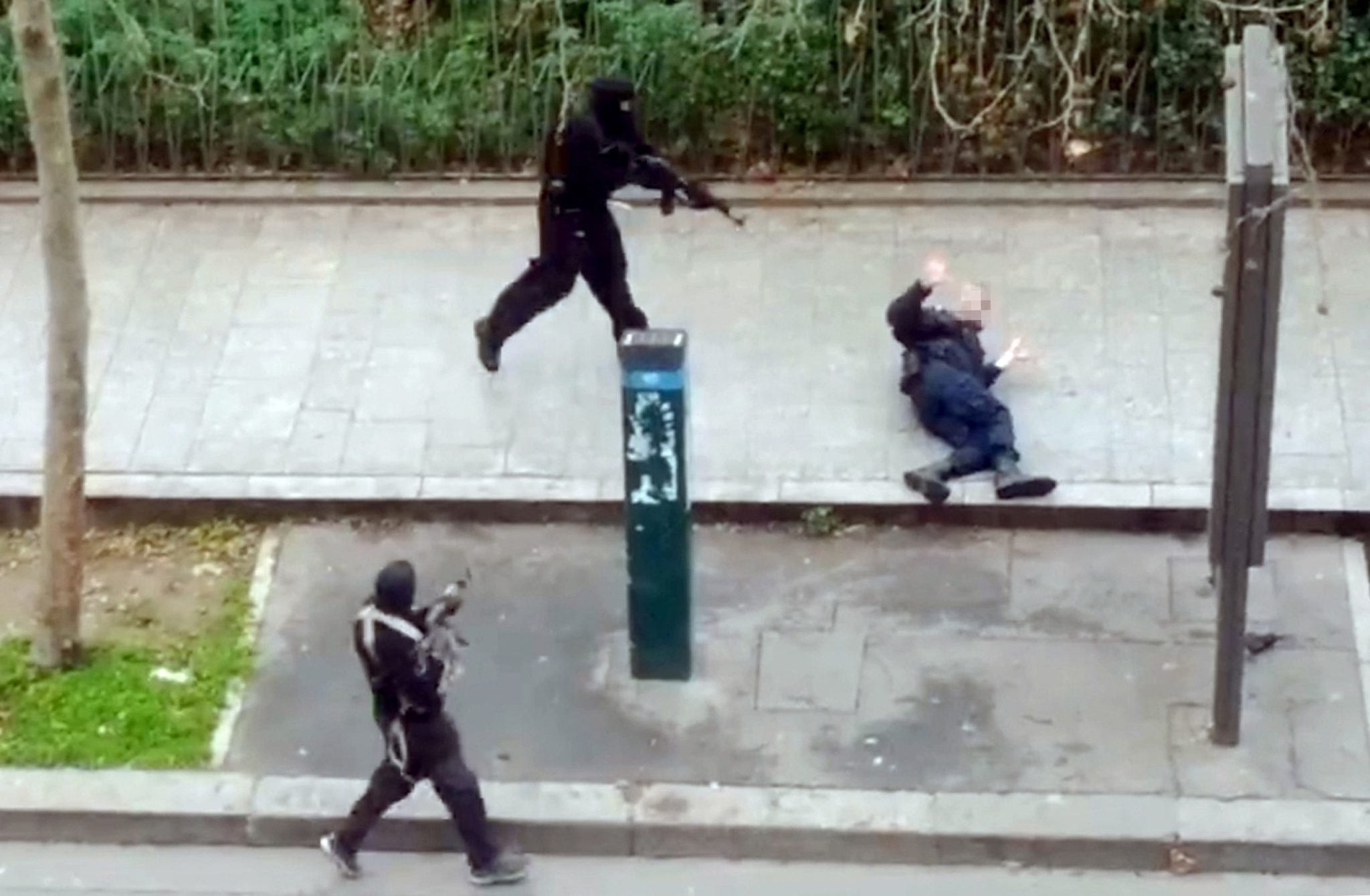 En politimann som er blitt såret i forbindelse med terrorangrepet mot Charlie Hebdos redaksjon i Paris den 7. januar 2015, blir drept med skudd mot hodet innen terroristene rømmer fra åstedet. Foto: Jordi Mir / AFP / Scanpix.