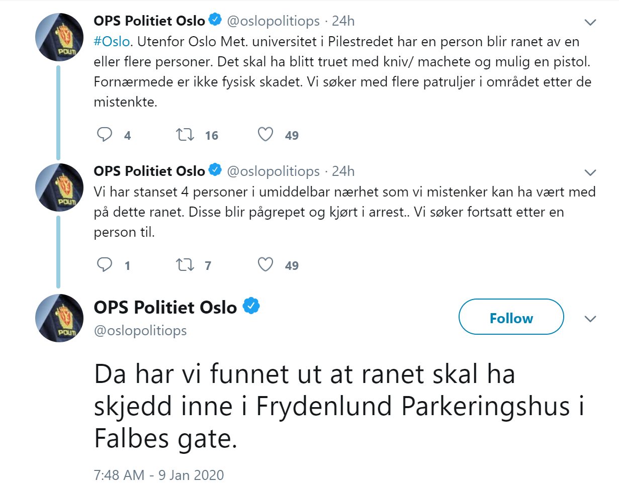 Politiet fikk den første meldingen om ranet klokken 15.46. Tre kvarter senere opplyste politiet at de hadde stanset fire personer i nærheten som de mistenker at kan ha vært med på ranet.